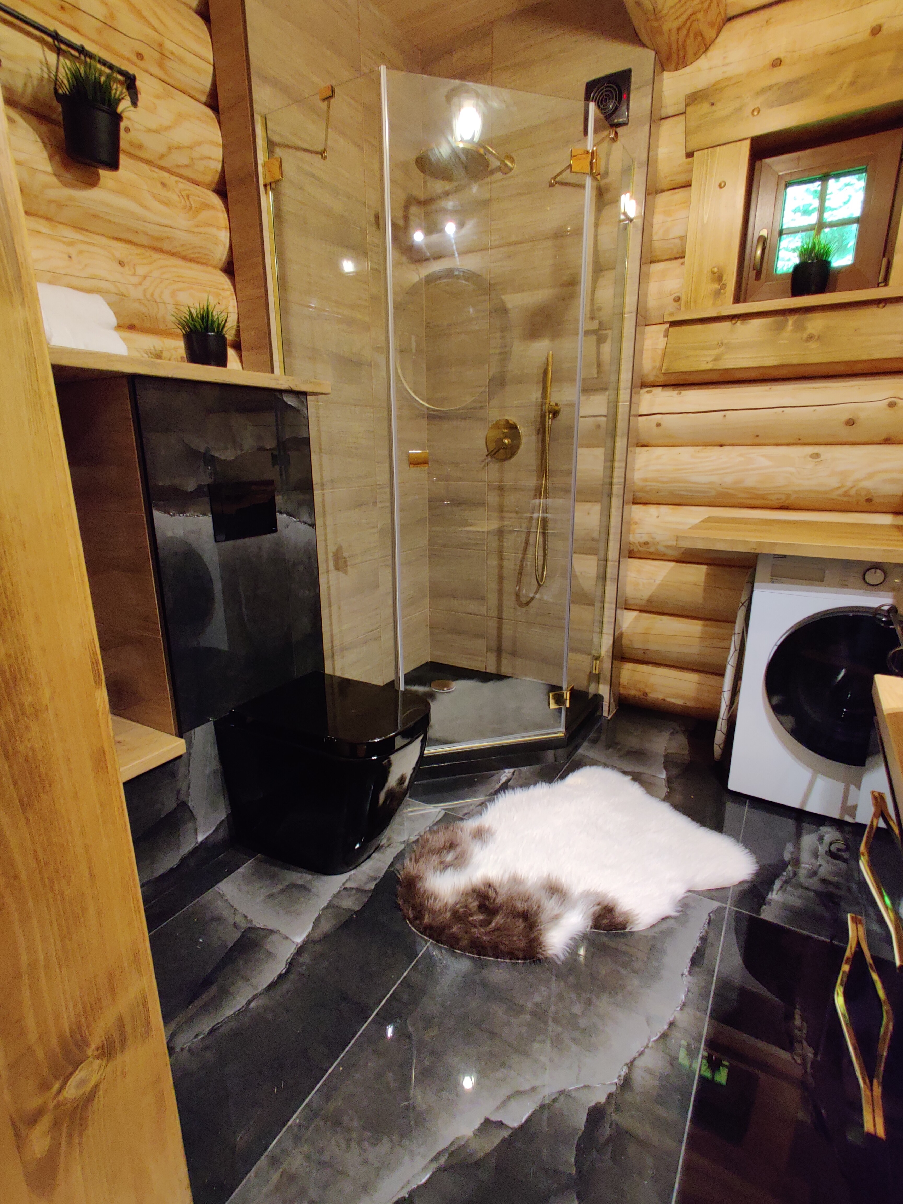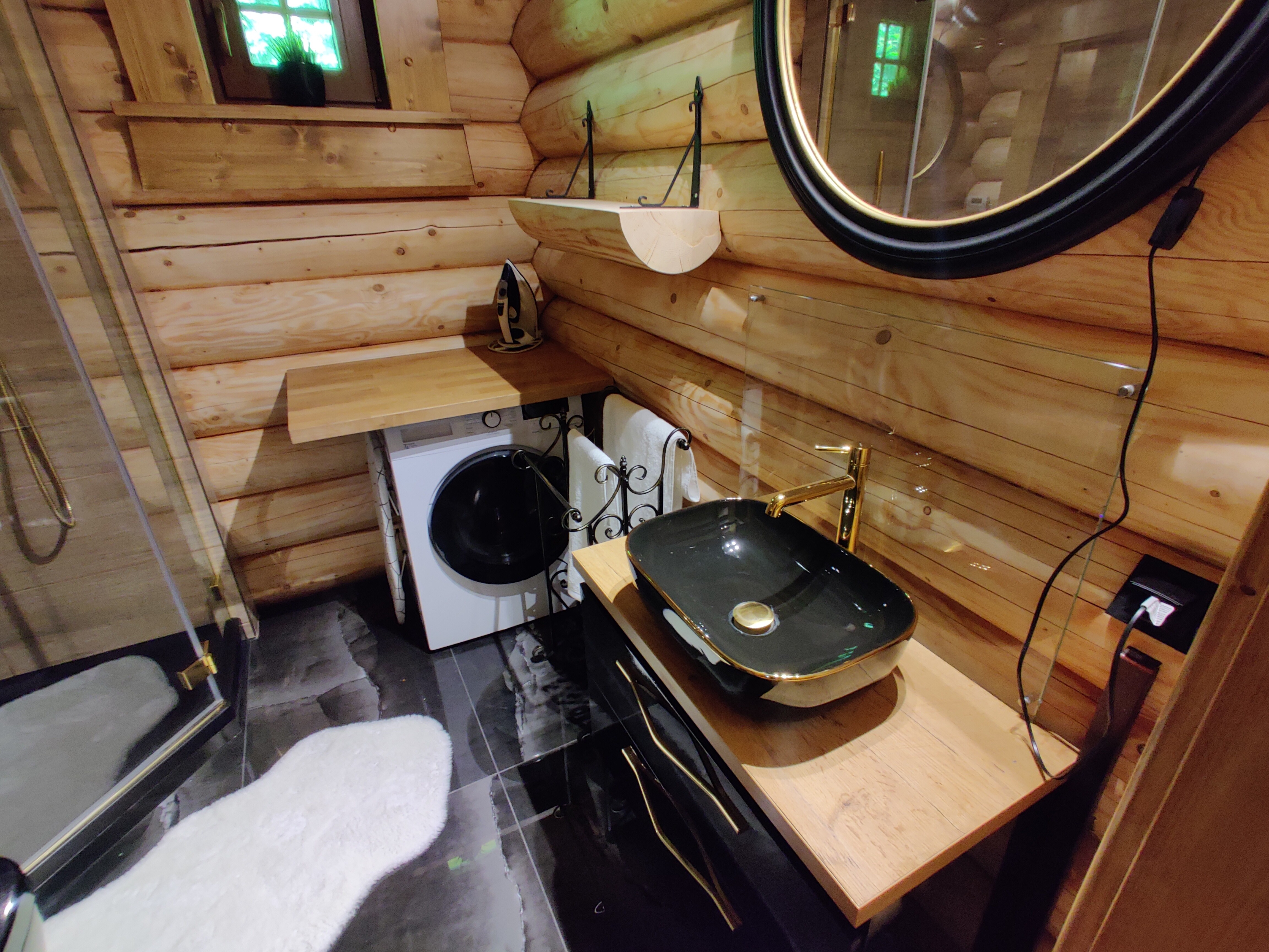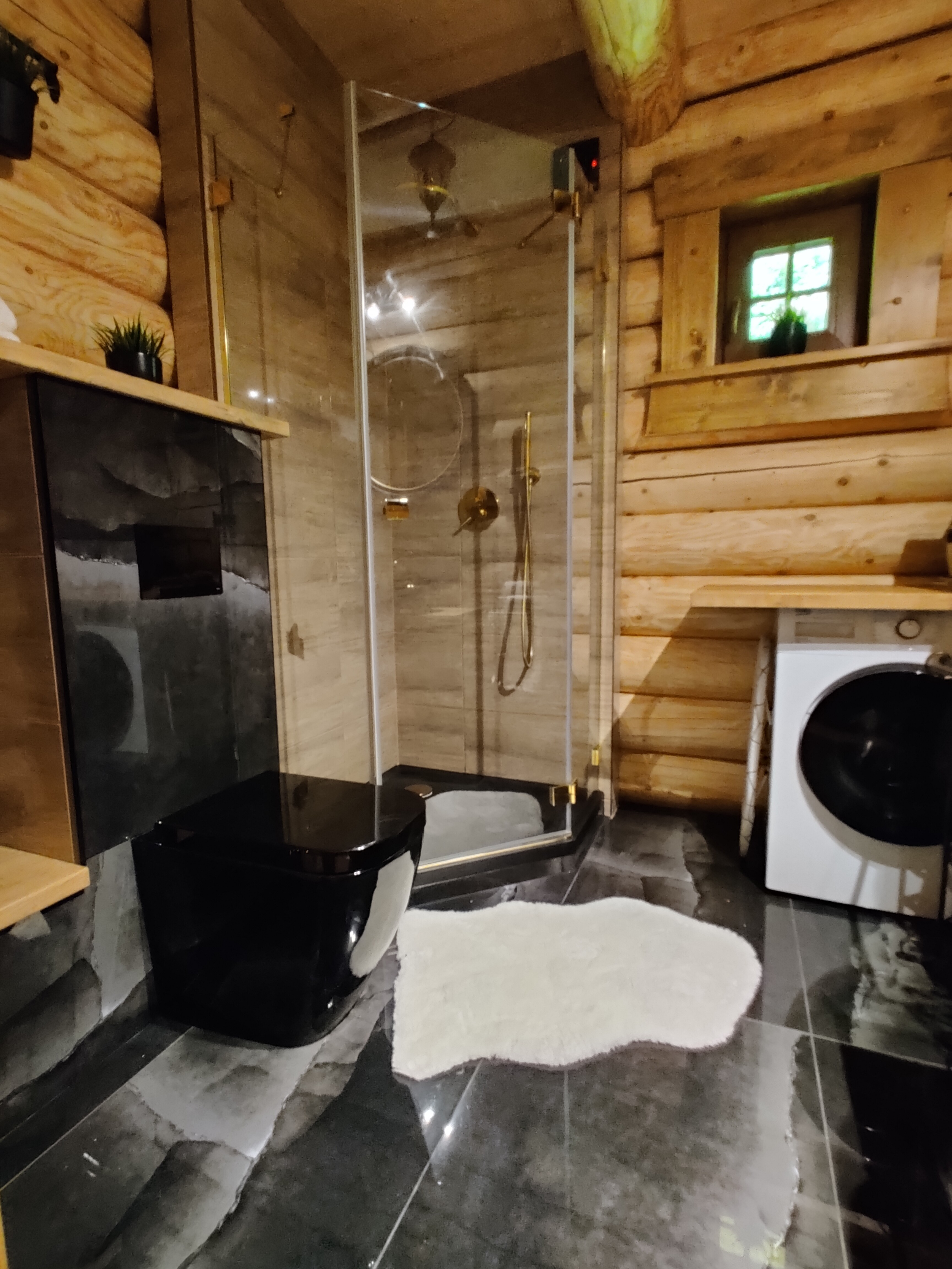 Domek wyposażony jest w pralko-suszarkę, lodówkę, zmywarkę, suszarkę, zestaw do prasowania, expres do kawy, Smart TV, gry planszowe jacuzzi oraz w pełni wyposażoną kuchnie